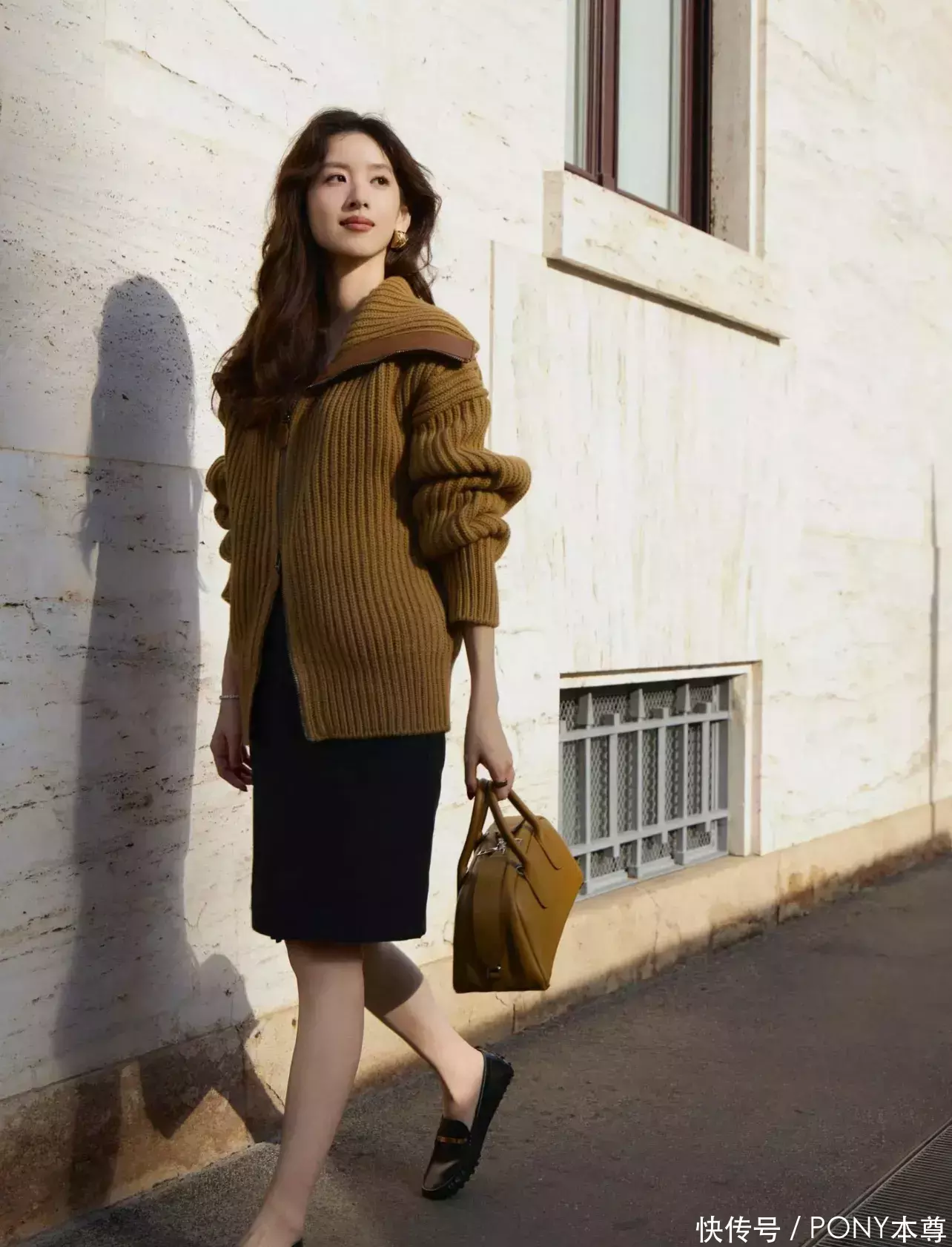 在拍摄时尚大片时,尽显轻熟范儿,身穿棕色针织开衫,搭配了黑色过膝半身裙,脚踩黑色乐福鞋,成熟大气,手上临着棕色单肩包,整体色系搭配很温柔。